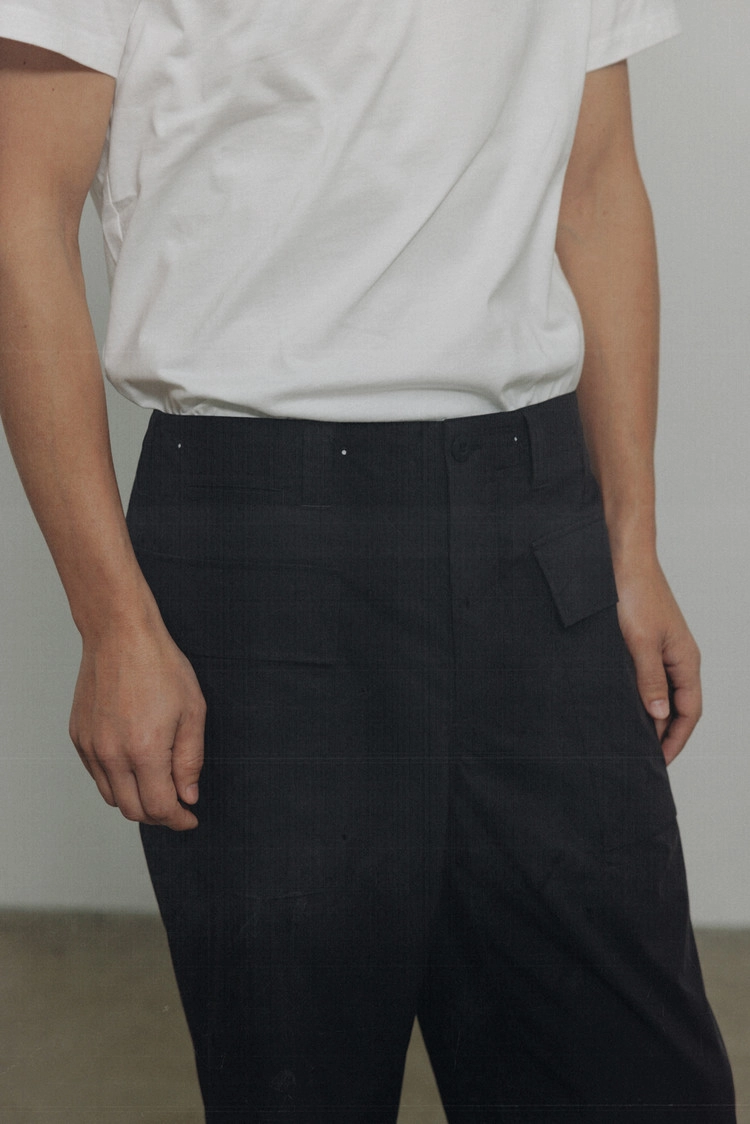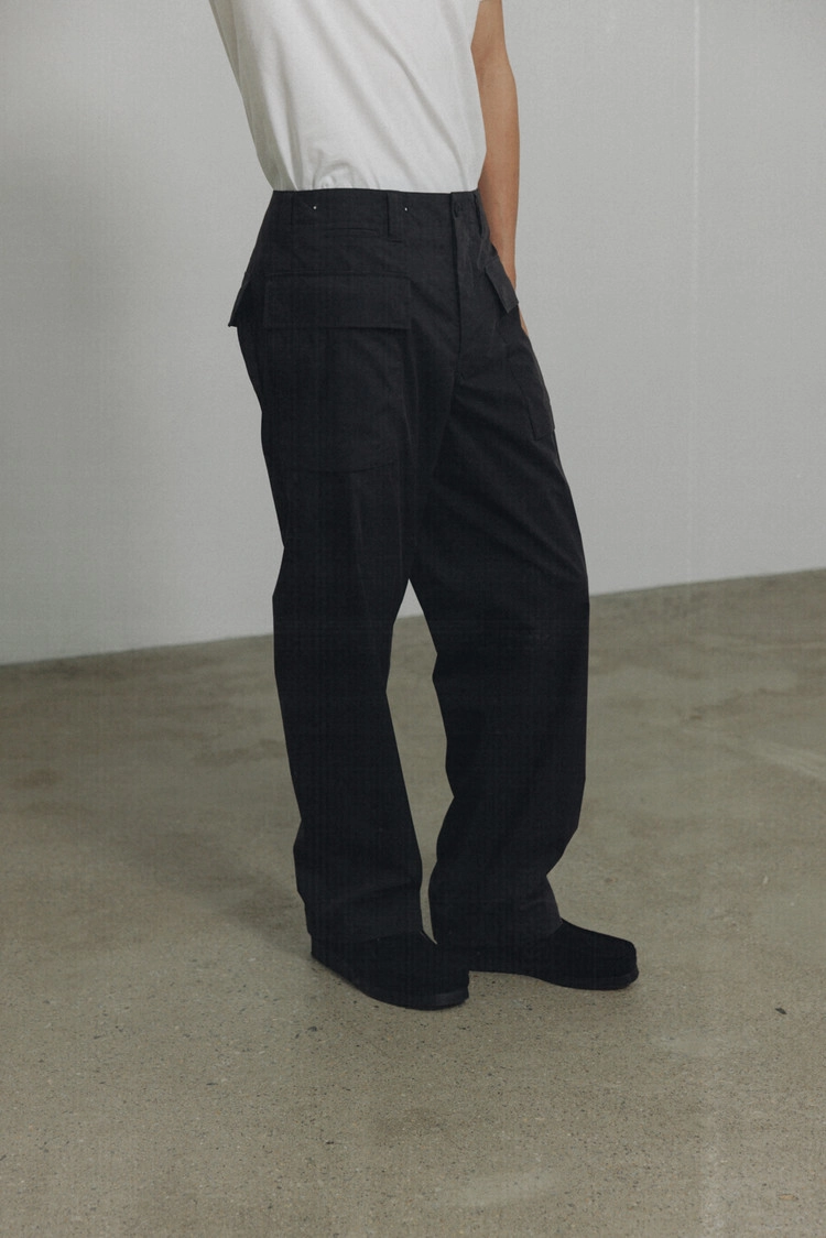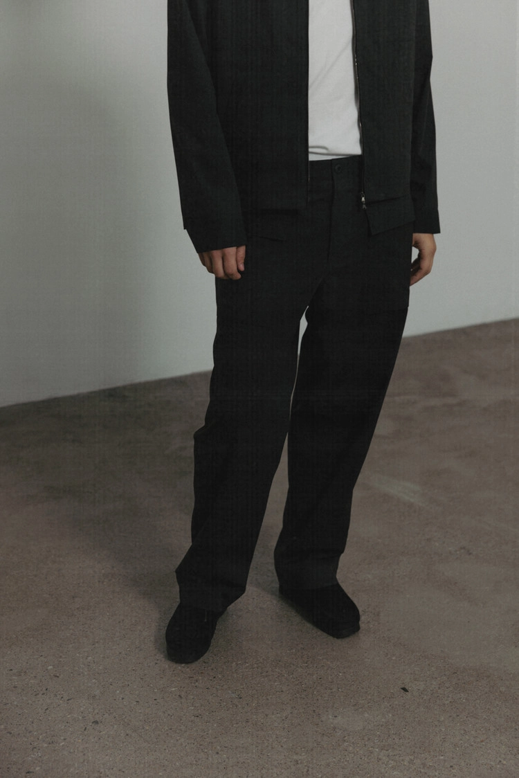 전면과 후면의 입체적인 포켓, 허리 밴드의 통기성 및 허리 조절 기능을 갖춘 디테일이 특징인 제품입니다. 포켓 안쪽까지 세심하고 섬세한 스티치 작업을 거쳤으며, 다양한 무거운 물건을 수납할 수 있도록 이중으로 덧댄 구조로 제작되었습니다. 저압 가공 배선을 정리하는 전기원들이 실제 사용할 수 있도록 실용성을 고려한 디자인입니다. 1943년 HBT 몽키팬츠에서 영감을 받아 현대적으로 재해석한 제품입니다.