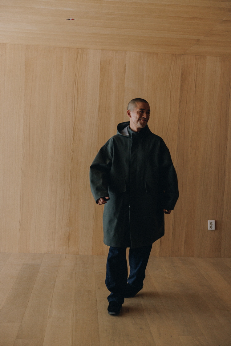 짐바브웨 코튼과 울을 혼합해 제직한 로우 데님 원단입니다. 겉면과 안쪽면의 질감을 다르게 표현했으며, 거칠고 투박한 느낌과 견고한 형태를 위해 느린 속도로 정교하게 직조했습니다.