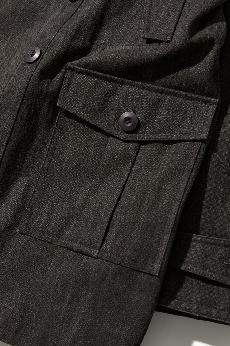 겉감은 ‘먹(SUMI)’을 흘려 염색하는 다잉 기법을 사용해 독특한 질감과 깊이 있는 컬러감을 표현했습니다. 안감은 무게감과 새로운 촉감을 전달하기 위해, 겉면은 코튼, 안쪽 면은 폴리로 구성된 특수 원단을 사용하여 제작했습니다. 1930년대 독일군 피코트를 현대적으로 재해석한 제품입니다.