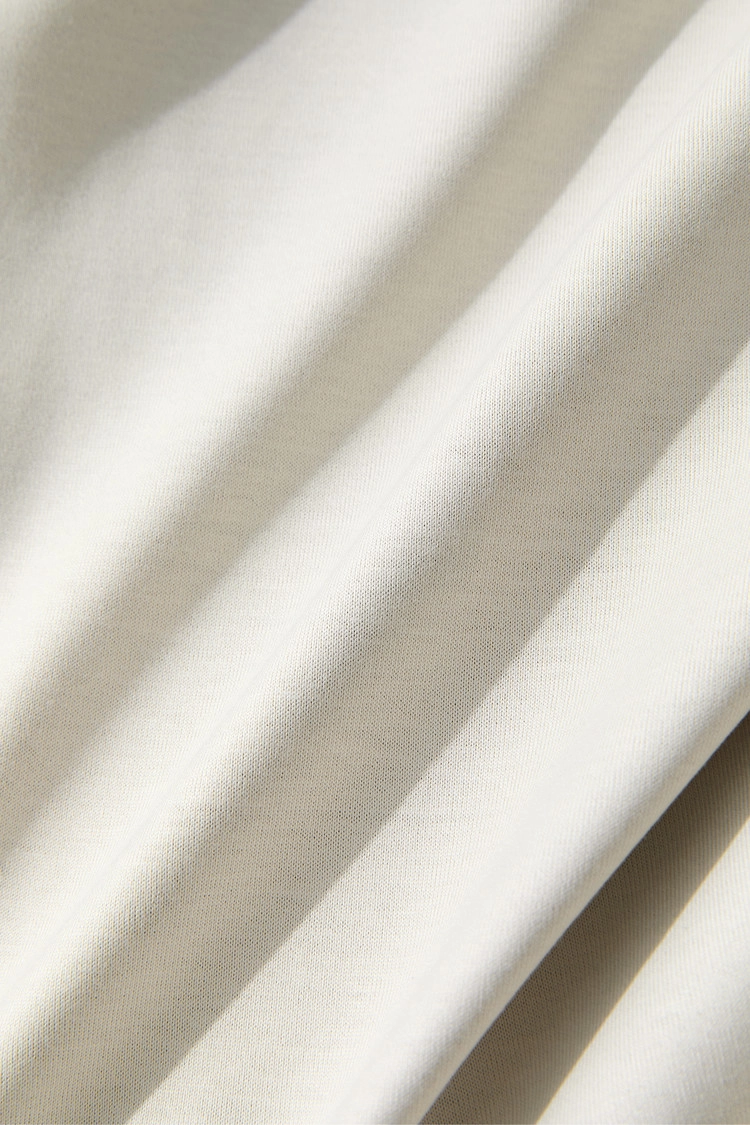 한계치까지 밀도를 끌어올린 오가닉 코튼 저지 원단을 사용해, 저지 특유의 편안함과 실크와 같은 부드러운 터치를 동시에 구현했습니다. 일반 코튼에서는 경험하기 어려운 촉감과 함께, 필링(보풀)에 강한 우수한 내구성을 갖춘 소재입니다.