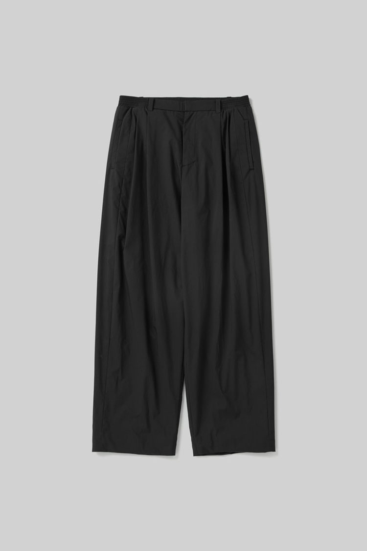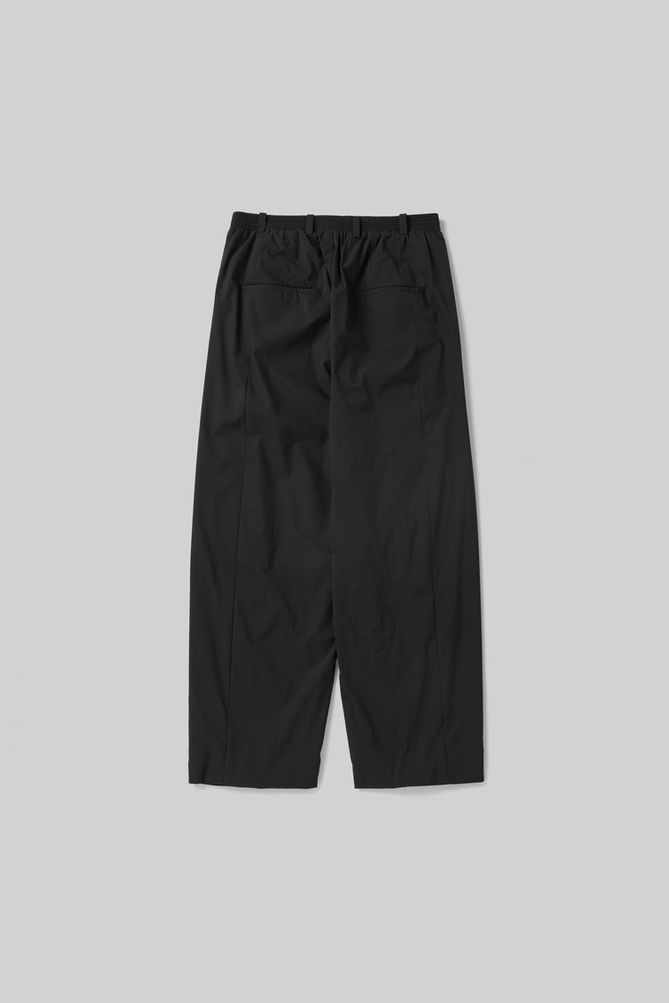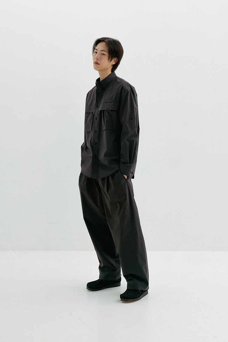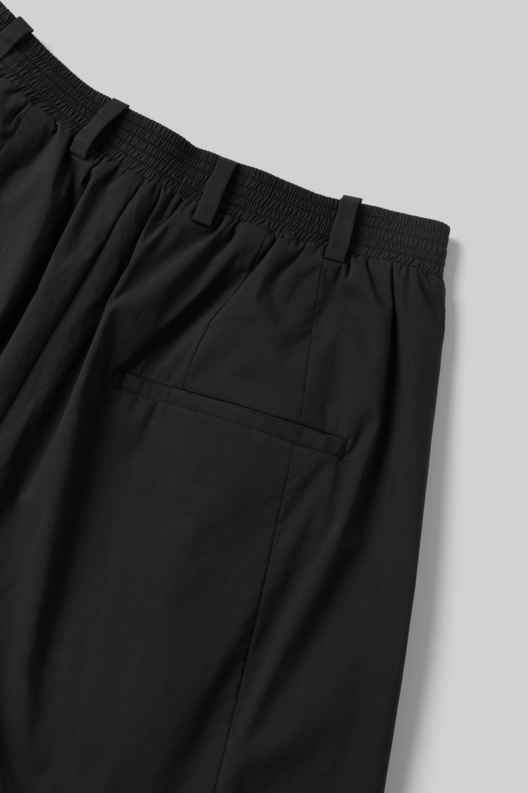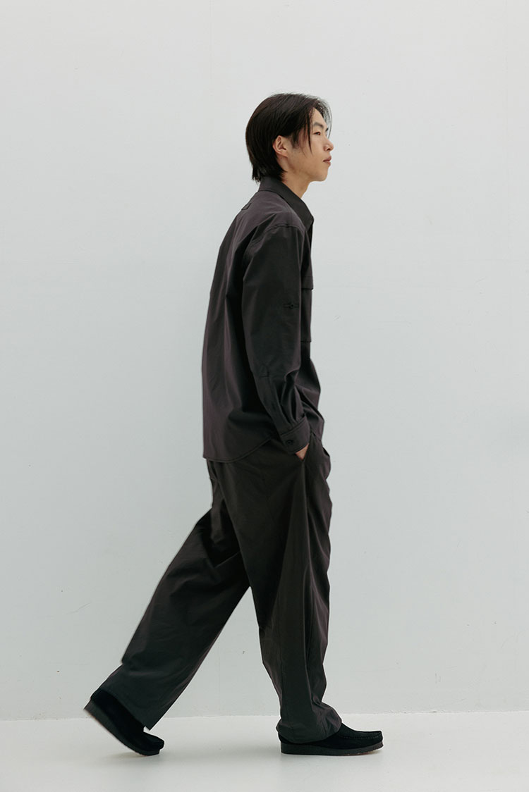 허리에서 밑단으로 떨어지는 풍성한 라인이 특징인 제품입니다. 두 줄의 주름 깊이와 폭을 다르게 잡아 둔품을 풍성하게 하여 볼륨감 있는 패턴을 중점으로 두었습니다. 허리 뒷 라인의 밴딩 처리 및 옆선 라인 뒤쪽으로 주머니를 넘겨 착용 시 편의성을 높였습니다.
