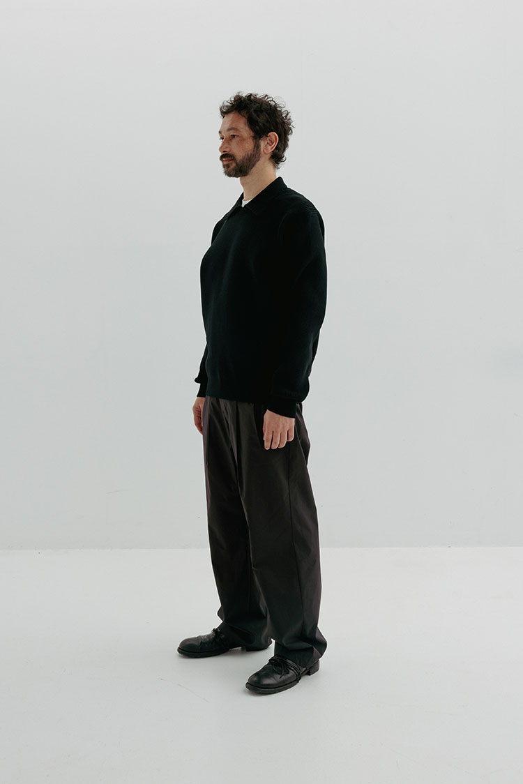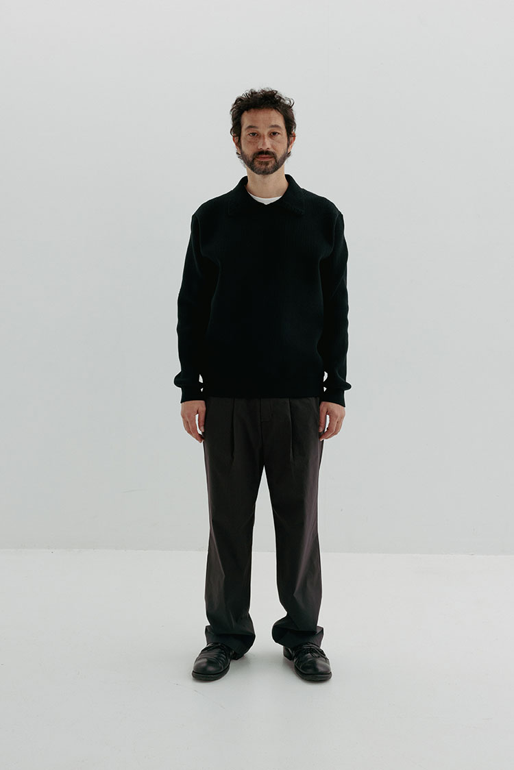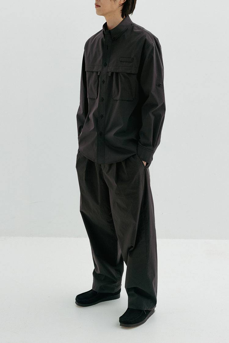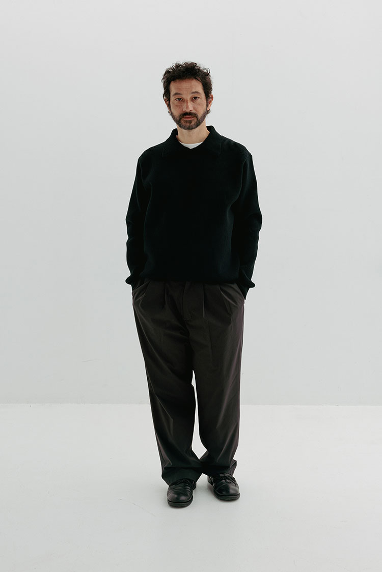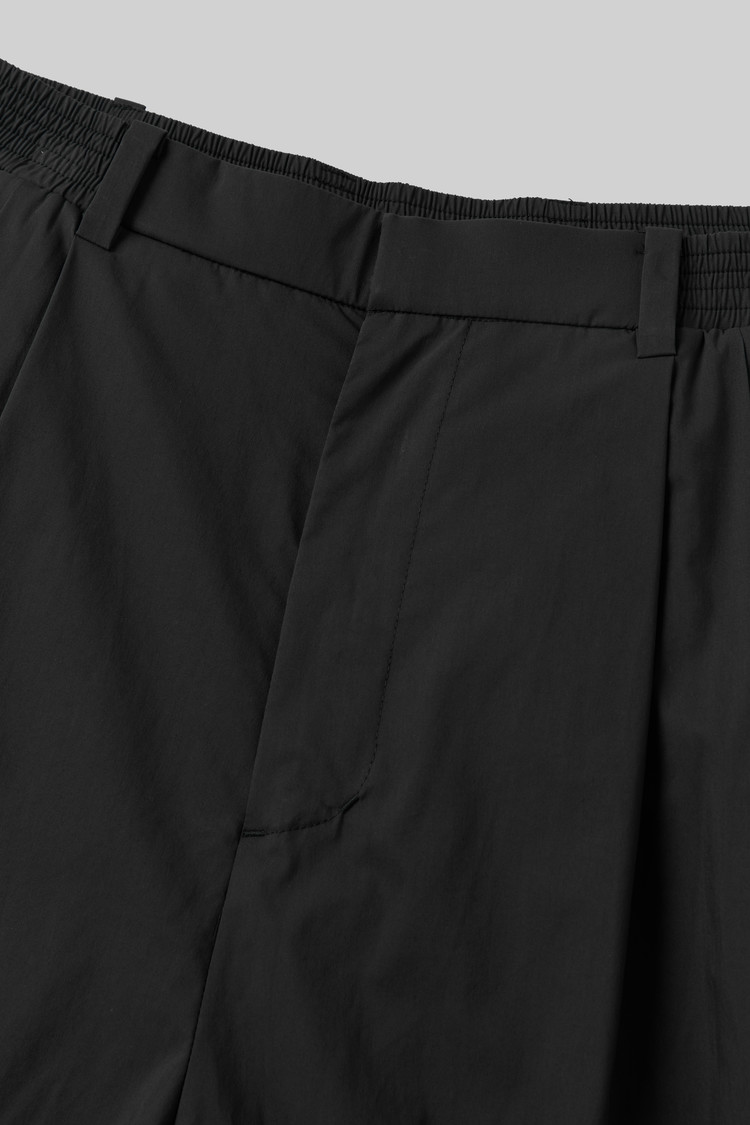 허리에서 밑단으로 떨어지는 풍성한 라인이 특징인 제품입니다. 두 줄의 주름 깊이와 폭을 다르게 잡아 둔품을 풍성하게 하여 볼륨감 있는 패턴을 중점으로 두었습니다. 허리 뒷 라인의 밴딩 처리 및 옆선 라인 뒤쪽으로 주머니를 넘겨 착용 시 편의성을 높였습니다.