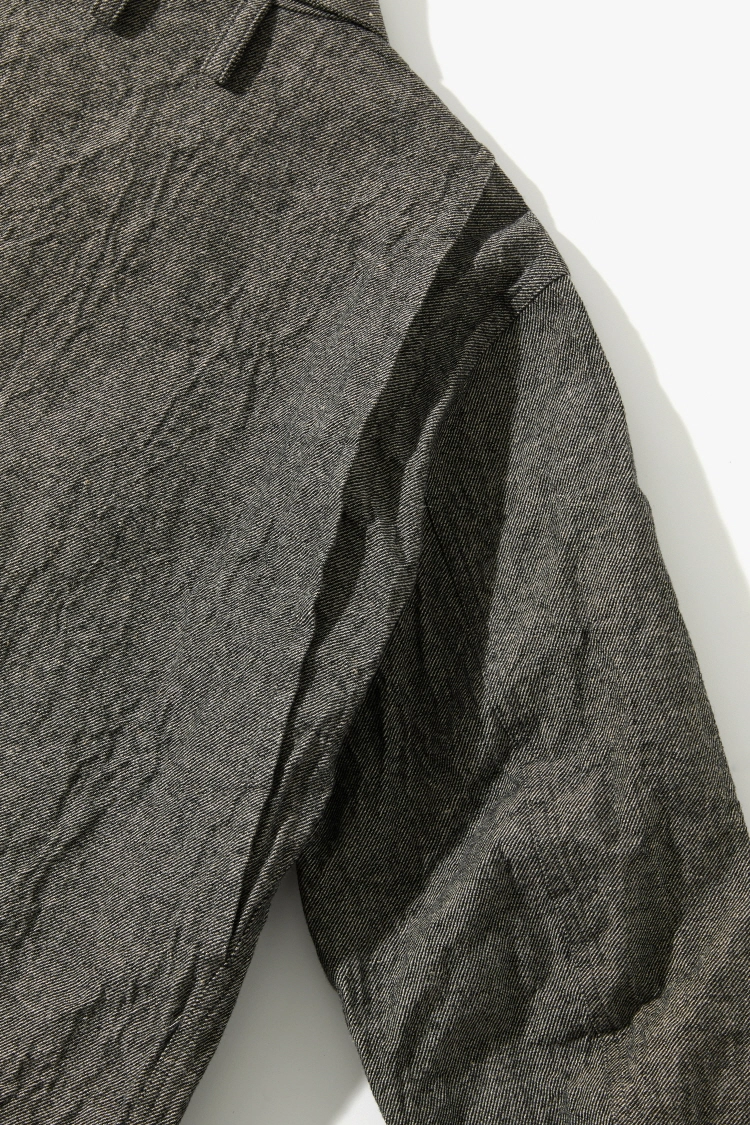 멜란지 트윌 형태의 울과 린넨 혼방 원단입니다. 자연스럽고 거친 느낌의 헤어리가 돋보이는 고밀도 소재로, 부드럽고 소프트한 질감이 특징입니다.